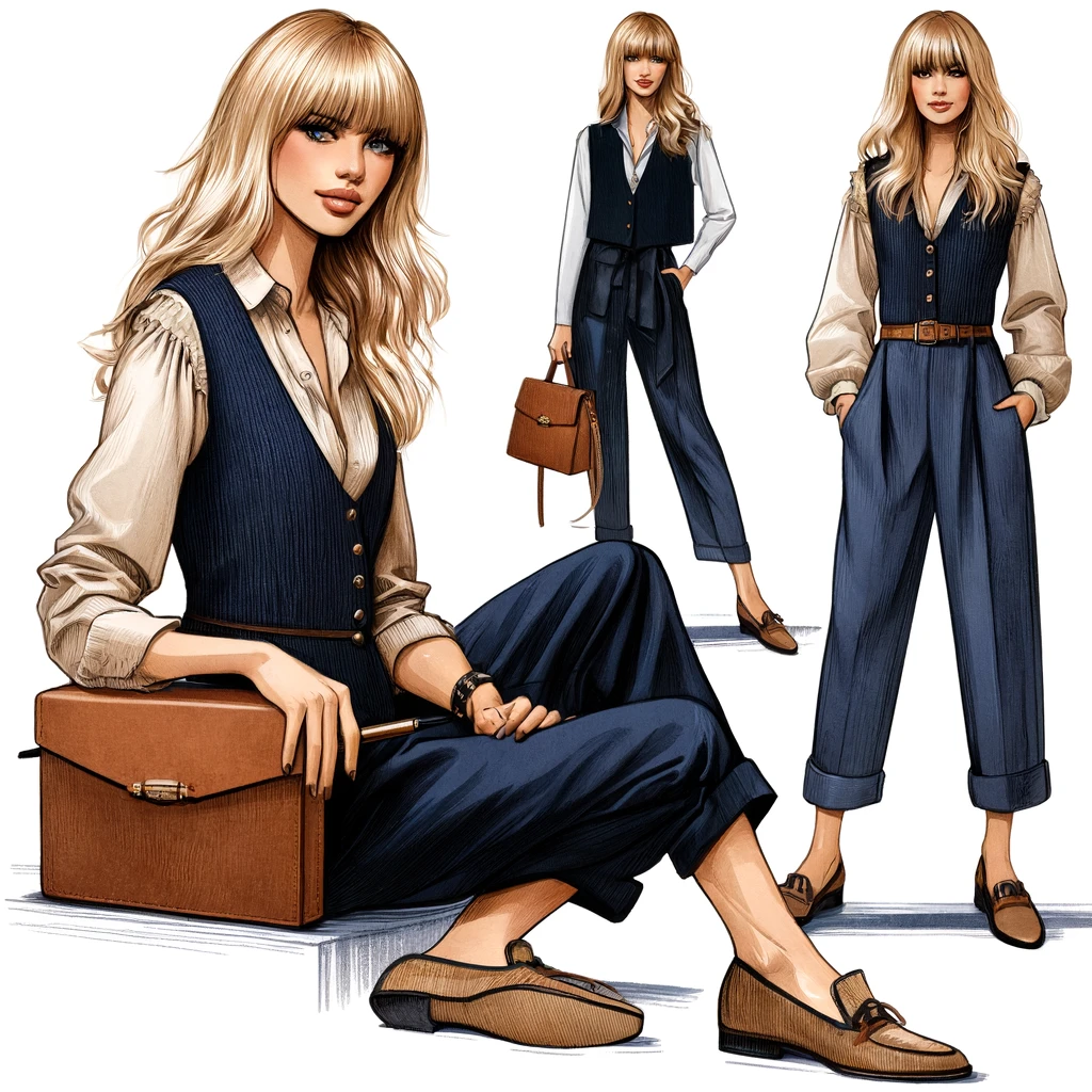 Fashion illustration of a woman in a beige blouse and navy blue vest and pants, shown sitting, standing, and with hands in pockets, carrying a brown briefcase, wearing brown shoes, with wavy blonde hair.