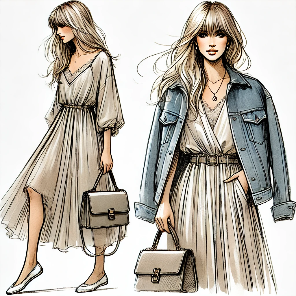 Fashion illustration of two women in stylish outfits. The woman on the left is wearing a beige, flowing dress with elastic waist and holding a beige handbag, with blonde hair. The woman on the right is dressed in a beige dress with a belt, layered with a denim jacket, and also carrying a neutral handbag, with long blonde hair.